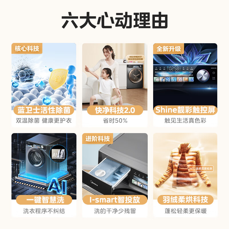 5、外形外观:很漂亮,而且是可触屏,有智能,用以旧换新,很划算。洗净效果:安装好就试了一次,洗的很干净,而且是智能投放,在也不用用多少洗衣液而发愁了。除菌效果:洗小朋友的衣服也放心了,洗完也是香香的味道。容量大小:一家五口的衣服完全够了。