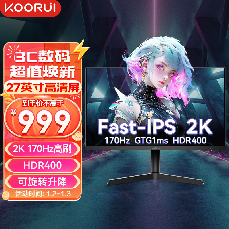 科睿 KOORUI 27英寸 2K高清 FastIPS 170Hz 1ms(GtG)HDR400 人体工学旋转升降支架 电竞游戏显示屏 27E1QX价格:1399.00元!