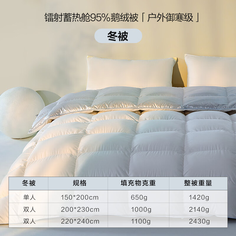 2、这个被子是双11的时候买的,还是非常满意的,一千元左右能够买到充绒量为1000g95绒的羽绒被还是非常物有所值的,这个被子无论是舒适度还是保暖性都非常好,很轻盈冬天晚上睡觉不会被压着喘不过气来,保暖效果很好,现在这个天气盖着甚至有点热。