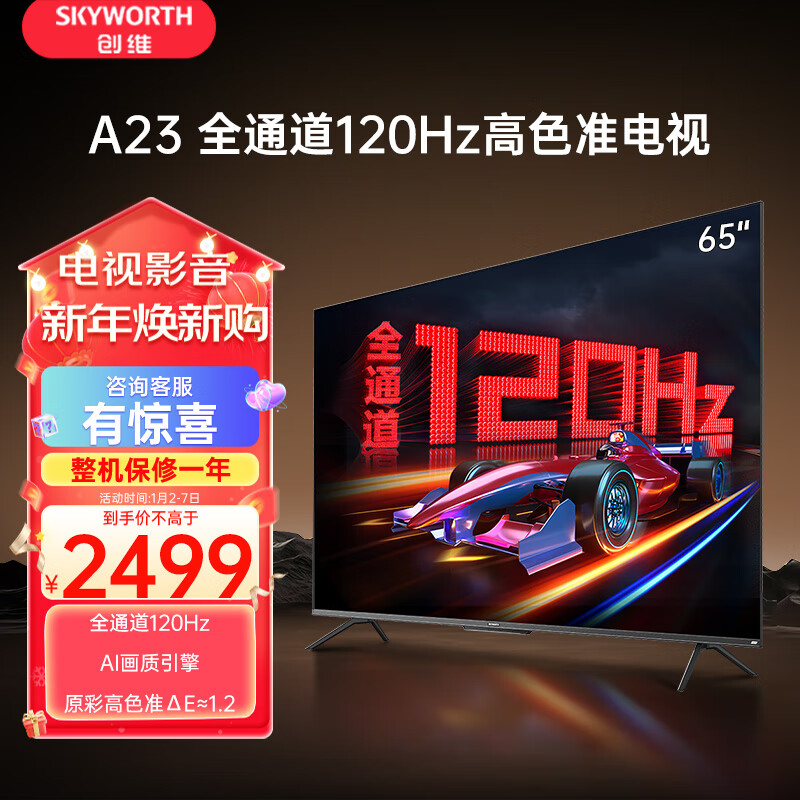 创维电视65A23 65英寸电视机全通道120Hz 2+32G4K超高清护眼声控屏智能液晶价格:2499.00元!