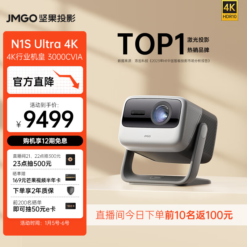 坚果(JMGO)N1S Ultra 4K超高清三色激光 云台投影仪家用电视家庭影院白天投墙游戏办公(3000CVIA 真4KHDR)价格:9499.00元!
