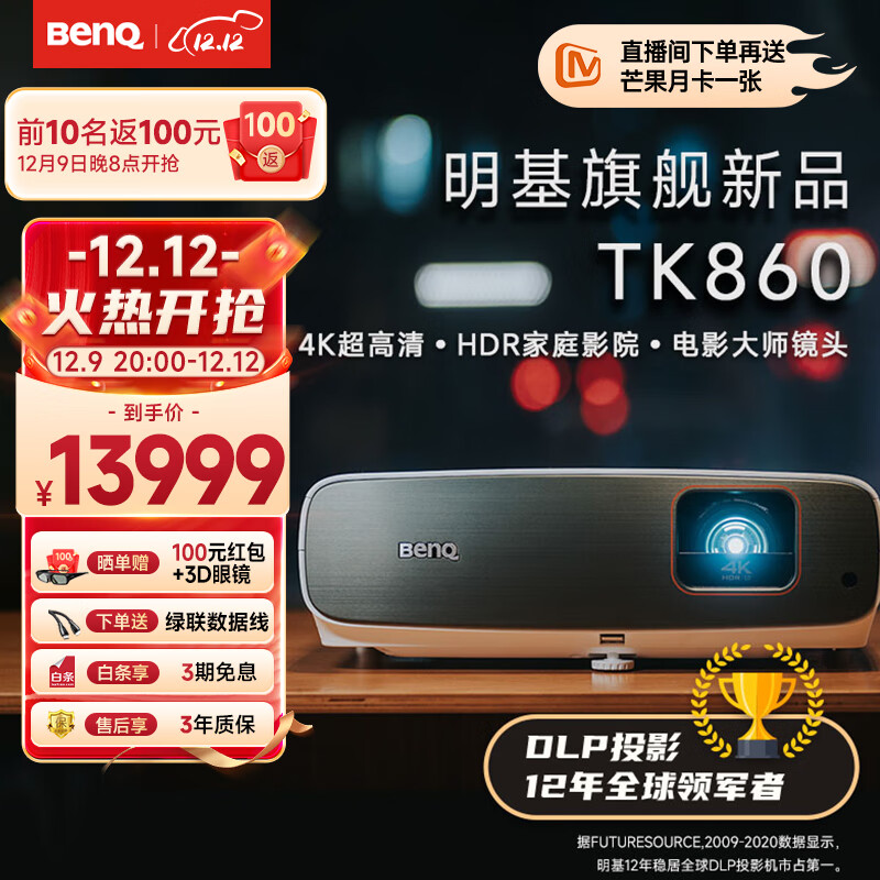 明基(BenQ) TK860投影仪家用 游戏投影 动态补偿(4K超清 3300流明 HDR Pro 镜头位移)价格:14999.00元!