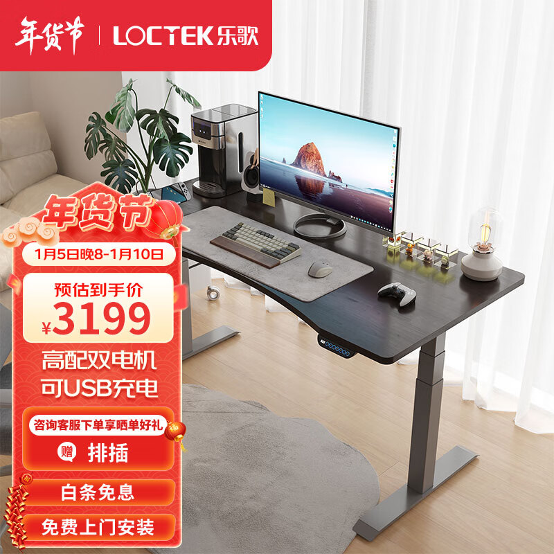 乐歌电动升降桌电脑桌站立办公学习桌 E5-N/1.6m 凹型实木黑胡桃木色价格:3529.00元!