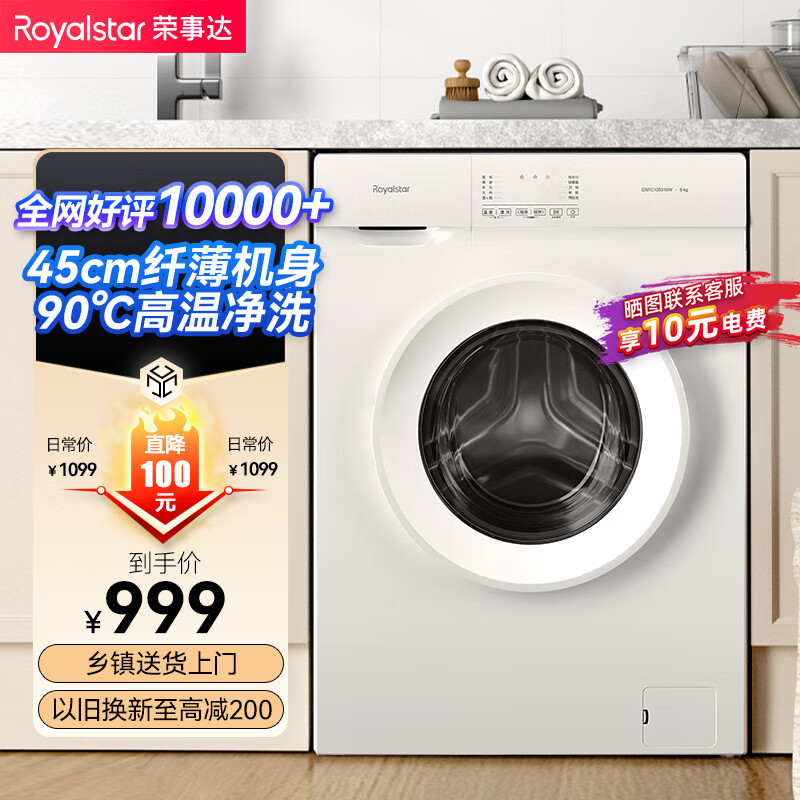 荣事达(Royalstar)洗衣机8公斤超薄全自动滚筒家用除螨洗内衣内裤儿童智能洗衣机甩干机以旧换新白色ERFC105016W价格:999.00元!