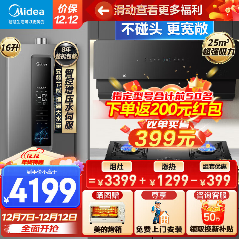 美的(Midea)侧吸抽油烟机灶具烟灶多件套装燃气热水器家用烟灶燃热厨房三件套JA7+Q330+16RF3天然气价格:4199.00元!