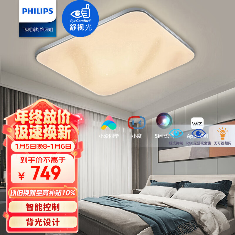 飞利浦led吸顶灯智能卧室书房餐厅现代简约灯具灯饰智控调光55W 美妍价格:969.00元!