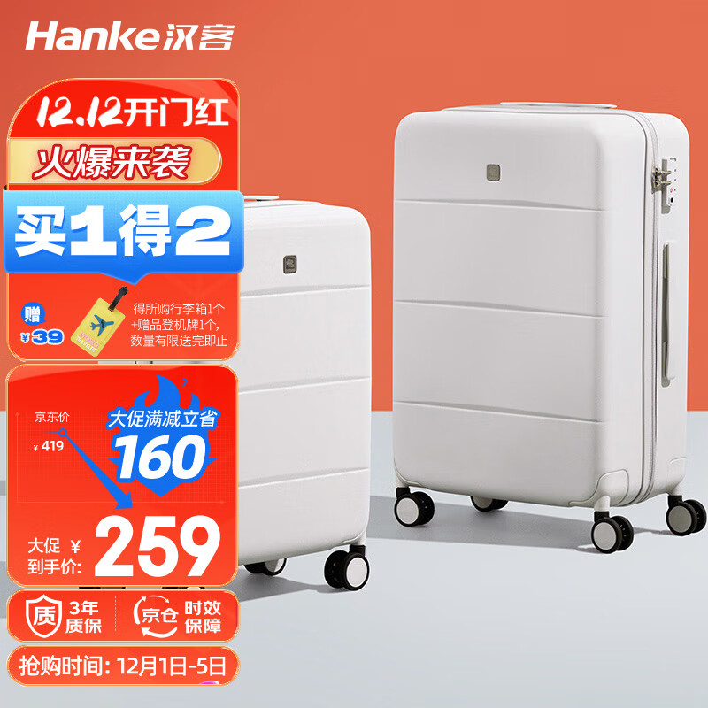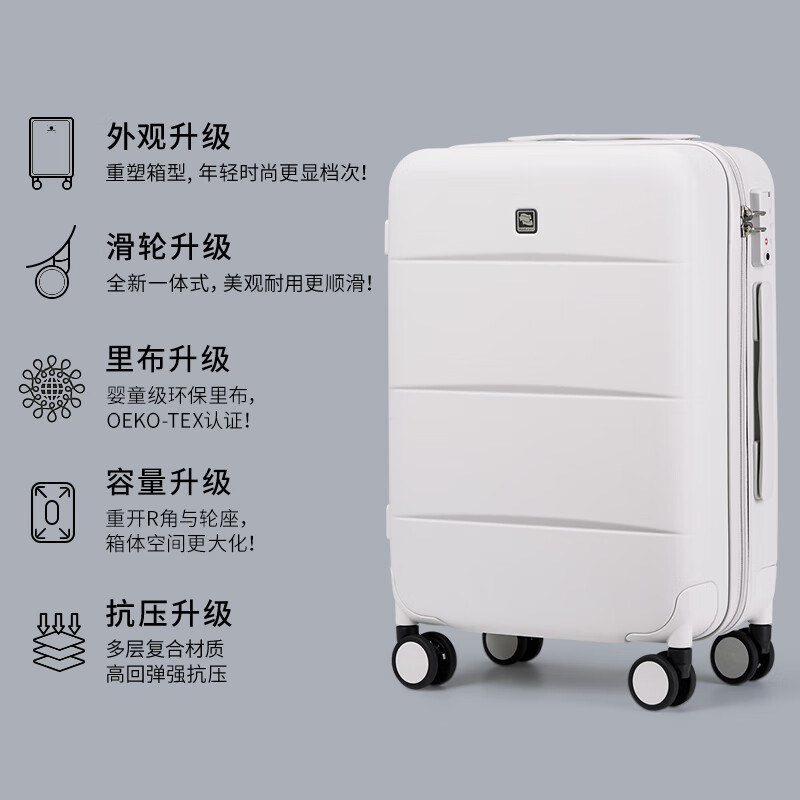 汉客行李箱男拉杆箱女登机旅行箱20英寸烟白色密码箱镇店颜值全新升级价格:419.00元!