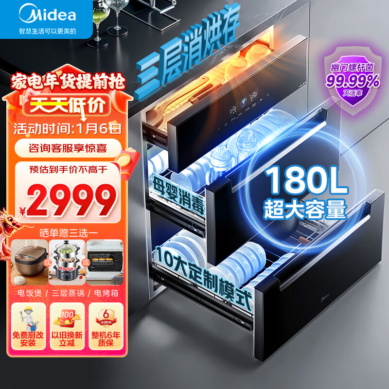 美的(Midea)消毒柜家用 嵌入式 厨房餐具碗柜碗筷 180L三层大升数 婴儿奶瓶不锈钢紫外线 AI家电200XQ2银河价格:2999.00元!