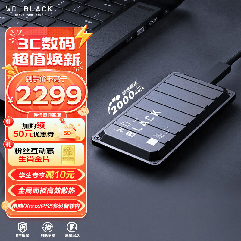 西部数据(WD)4TB NVMe 移动固态硬盘(PSSD)P50 type-c xbox游戏大容量ssd外接手机笔记本存储 2000MB/s价格:2299.00元!