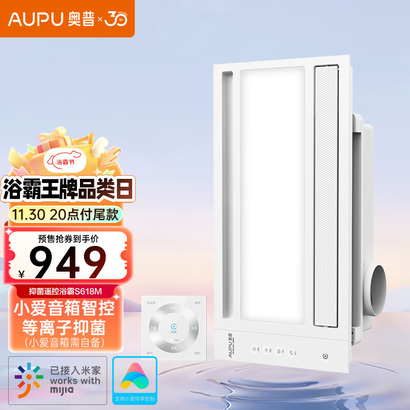 奥普(AUPU)浴霸S618M风暖浴霸 大摆页强弱风暖等离子除菌无线遥控已接入米家价格:1049.00元!
