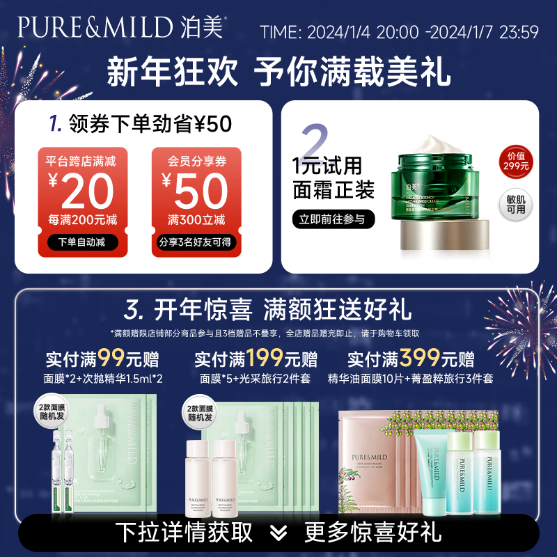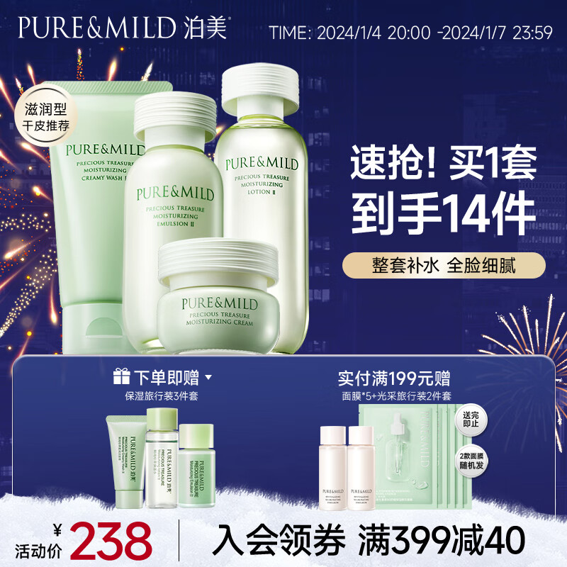 泊美(PURE & MILD)鲜纯珍萃保湿补水深层护肤四件套(洁面+爽肤水+乳液+面霜)价格:238.00元!