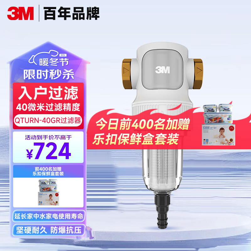 3M净水器家用净水机无需换芯40微米过滤全屋前置过滤器 QTURN-40GR价格:724.00元!