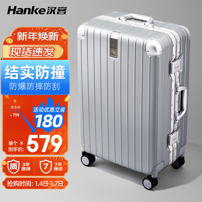汉客行李箱铝框箱男拉杆箱女旅行箱80多升大容量26英寸浅灰色密码箱价格:759.00元!