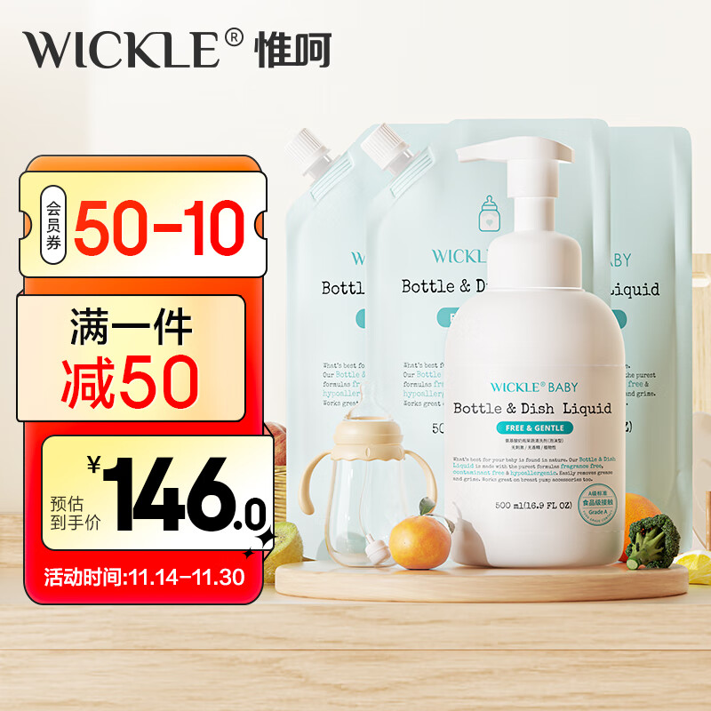 WICKLE氨基酸果蔬奶瓶清洗剂洗洁精宝宝专用奶嘴清洗液1瓶3袋组合装2L价格:196.00元!
