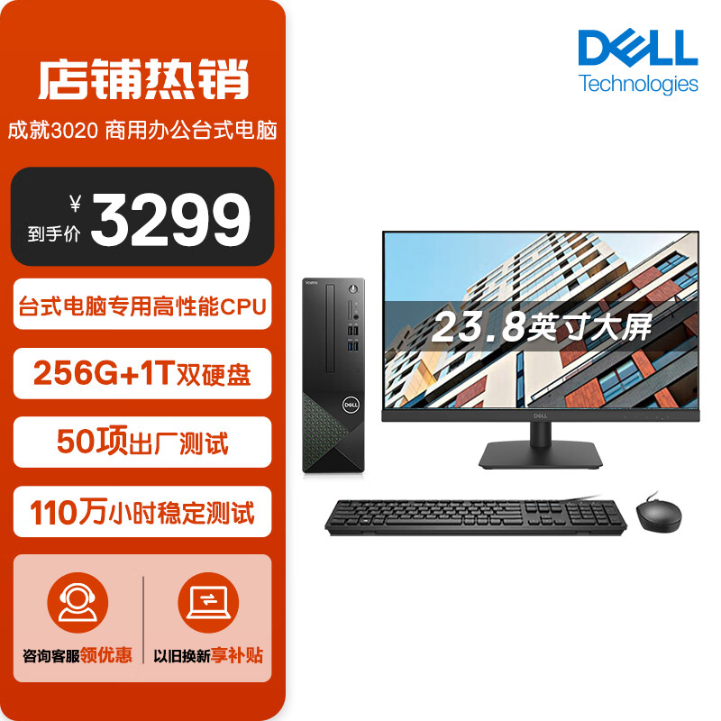 戴尔(Dell)成就3020 新款 台式电脑主机 高性能整机 台式机 商用办公电脑 教育学习 图形设计(13代i3-13100 8G 256GSSD+1TB三年上门)23.8英寸大屏显示器价格:3299.00元!