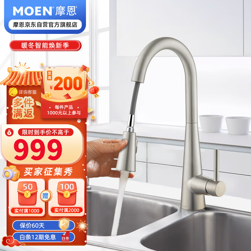 摩恩(MOEN)防指纹拉丝厨房龙头 抽拉式水槽洗菜盆洗碗盆冷热水龙头 59铜龙头价格:1199.00元!