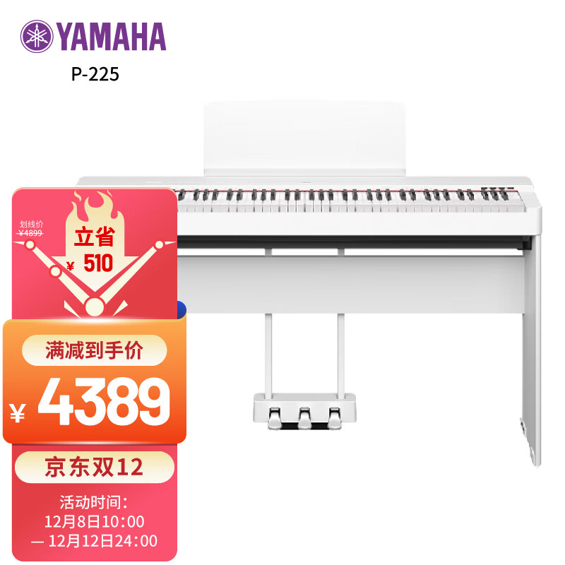 雅马哈P225WH重锤88键成人儿童数码电钢琴 主机+木琴架+三踏板价格:4899.00元!