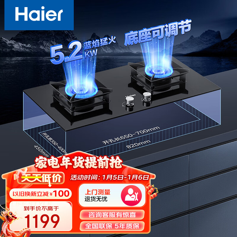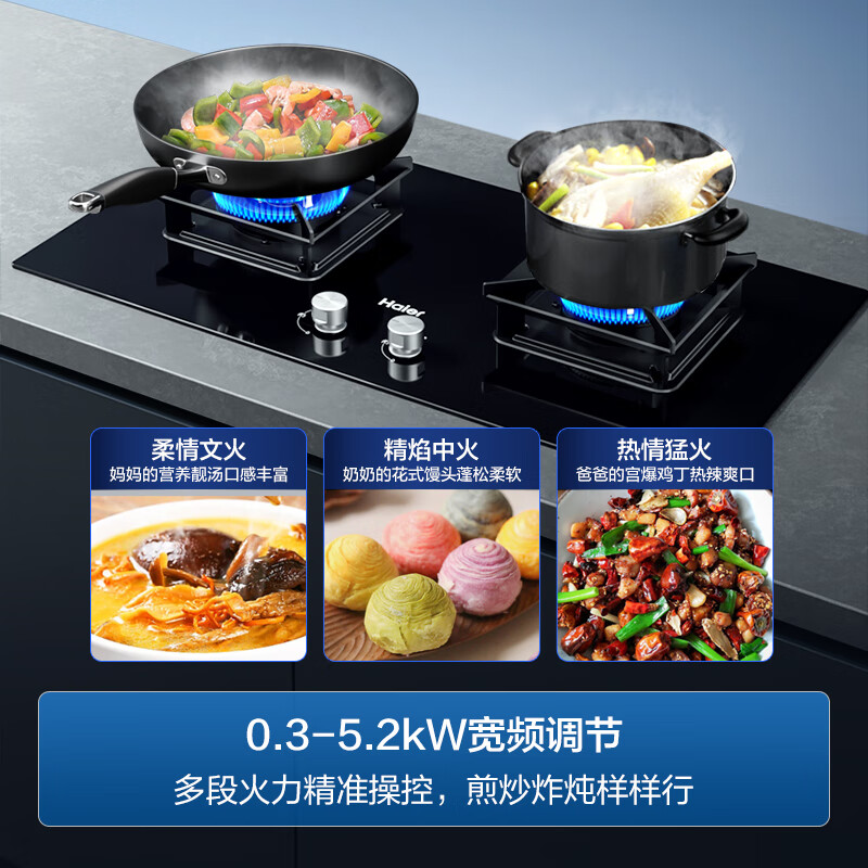 海尔(Haier)燃气灶天然气 家用双灶 5.2kw猛火灶 辟火聚能支锅架 820大灶面 熄火保护可调节底壳Q7BE3价格:1199.00元!