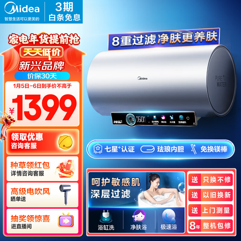 美的(Midea)净肤洗电热水器60升家用 3300W变频 出水断电 镁棒免更换 一级能效京东小家智能生态F6032-JA7(HE)价格:1499.00元!