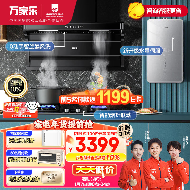 万家乐 烟灶热三件套 顶侧双吸油烟机23m3/min烟灶联动套装水量伺服器16L热水器AK6+KV063B+16T8天然气价格:3599.00元!