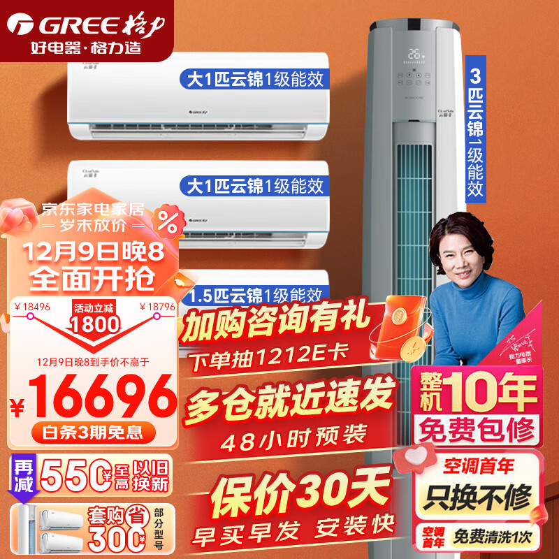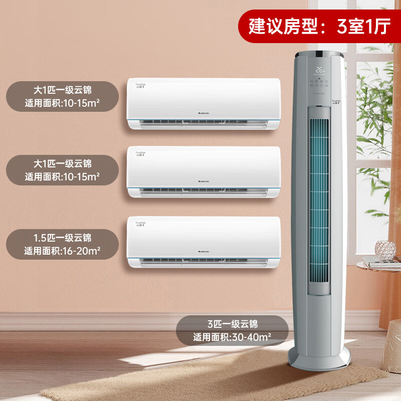 格力空调三室一厅组合套装 云锦 一级能效 冷暖变频自清洁 壁挂式立式 家用客厅卧室空调柜挂套餐价格:17396.00元!
