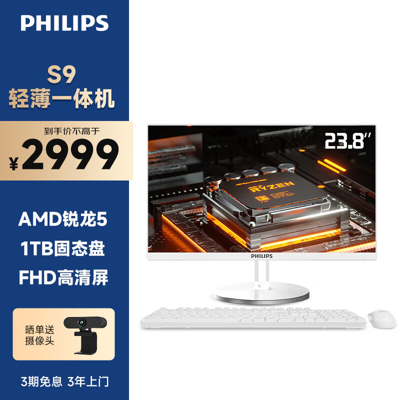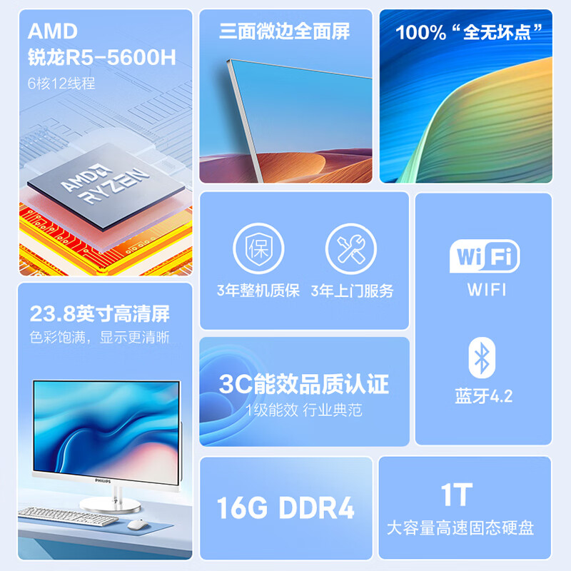 飞利浦S9 23.8英寸台式一体机电脑主机 家用网课学习高性能办公整机(R5 5600H 16G 1TB SSD 双频WiFi)白色价格:2999.00元!