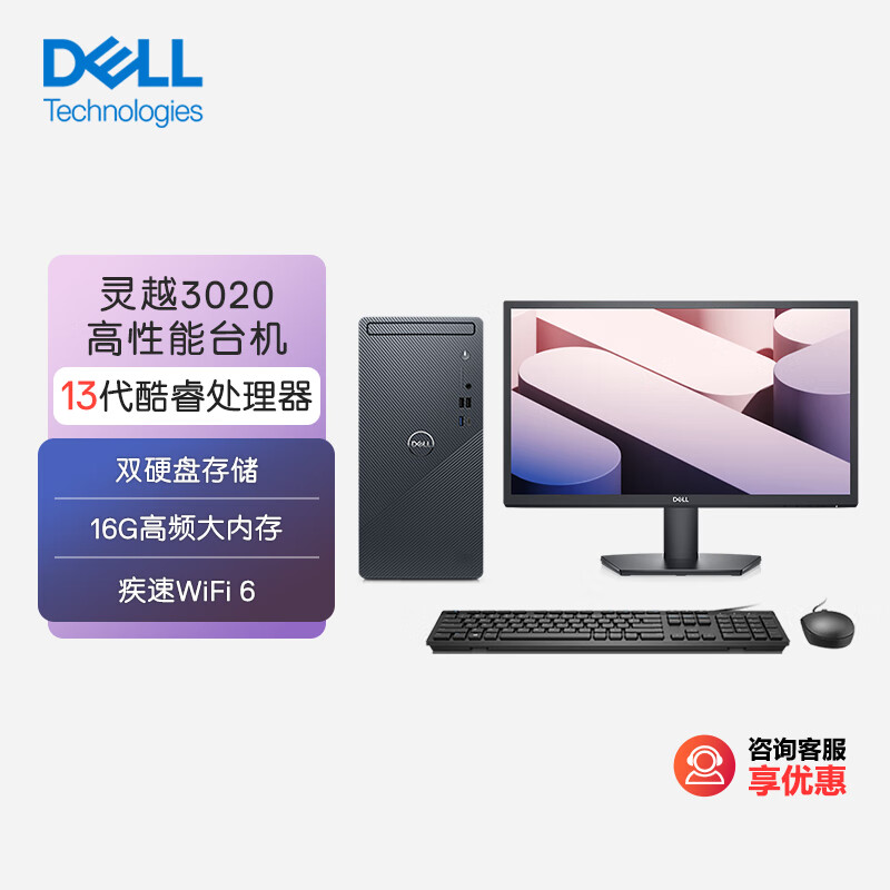 戴尔(Dell)灵越3020 新款 台式电脑主机 高性能整机 台式机 商用办公电脑 教育学习 图形设计 (13代i5-13400 16G 256GSSD+1TB三年上门)21.5英寸显示器价格:4799.00元!