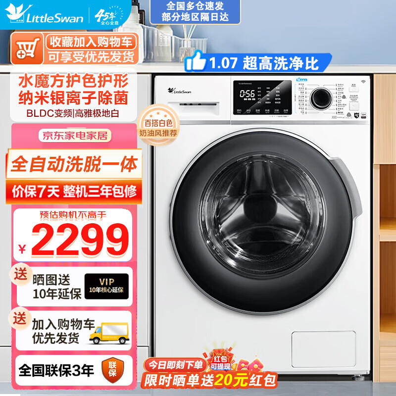 小天鹅(LittleSwan)10公斤滚筒洗衣机全自动 家用大容量水魔方防缠绕护形护色变频除菌智能家电白色TG100VT86WMAD5价格:2199.00元!
