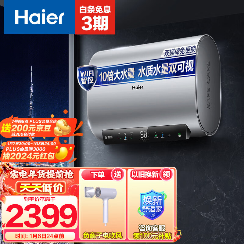 海尔(Haier)60升超薄扁桶双胆电热水器3300W大功率速热大水量一级能效节能 EC6001HD-BK1银U1价格:2599.00元!