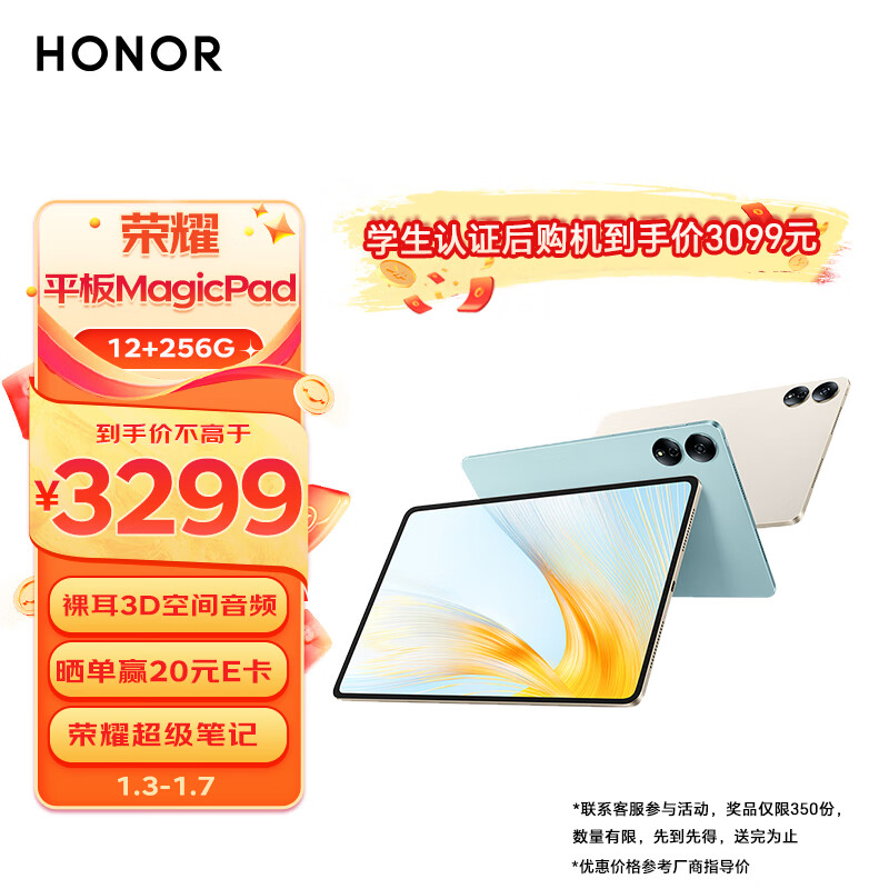 荣耀平板MagicPad 13英寸 8扬声器 144Hz高刷护眼 2.8K超清 移动办公影音娱乐平板 WIFI 12GB+256GB 月色价格:3299.00元!