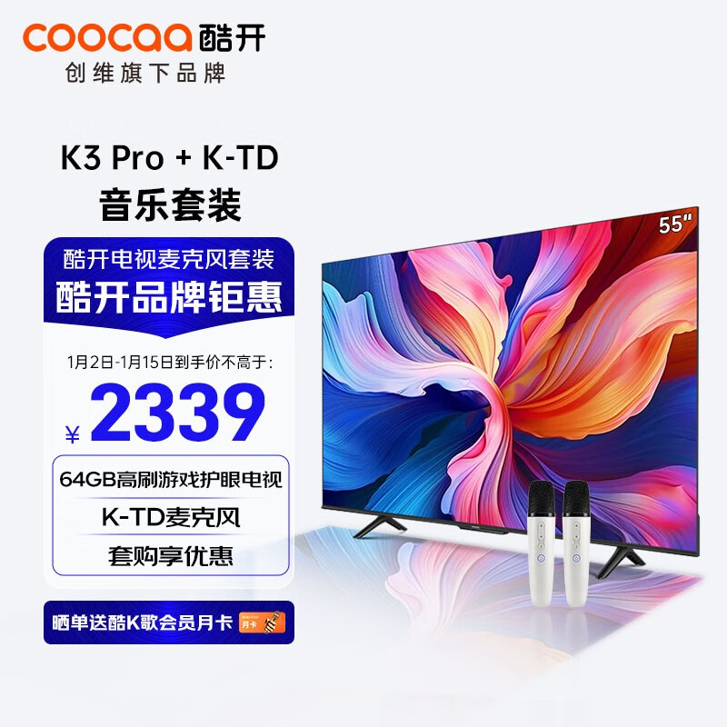 酷开创维 55英寸高刷电视机K3 Pro+K-TD麦克风套装 K歌电视 家庭KTV无线降噪话筒唱歌会议 双支麦克风价格:2339.00元!