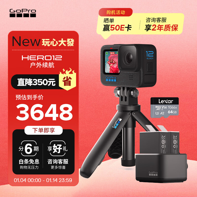 GoPro HERO12 Black运动相机 潜水防抖摄像机 vlog数码防水相机 户外续航套餐【shorty+增强双充+64G内存卡】价格:3648.00元!