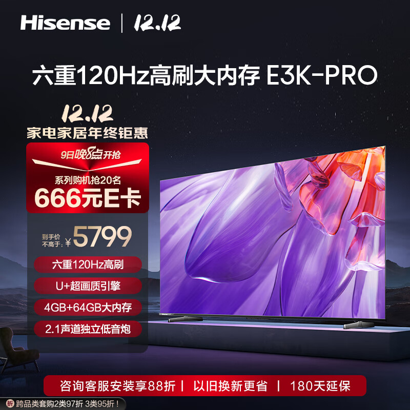 海信电视85E3K-PRO 85英寸 120Hz 130%色域 MEMC 4+64GB 远场语音 智能平板巨幕电视机价格:5799.00元!