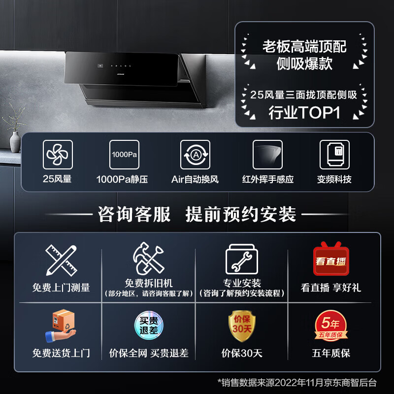 1、外形外观:颜值非常高,好看,挥手控制不错,很好用。排烟效果:风力很大,效果不错,物流速度:送货很快,有预约,安装上门。之前家里用的就是老板的,质量过关,很多年了,这一次还是选择老板。