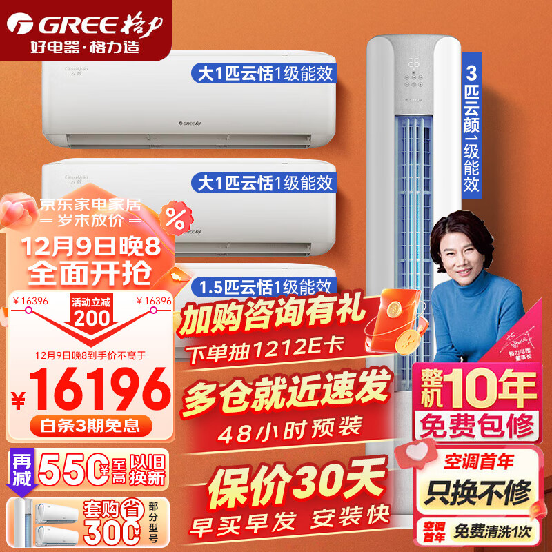 格力空调 客厅 云颜新一级能效变频 快速冷暖 客厅三室一厅大套装(72云颜+35云恬+26云恬×2)价格:16396.00元!