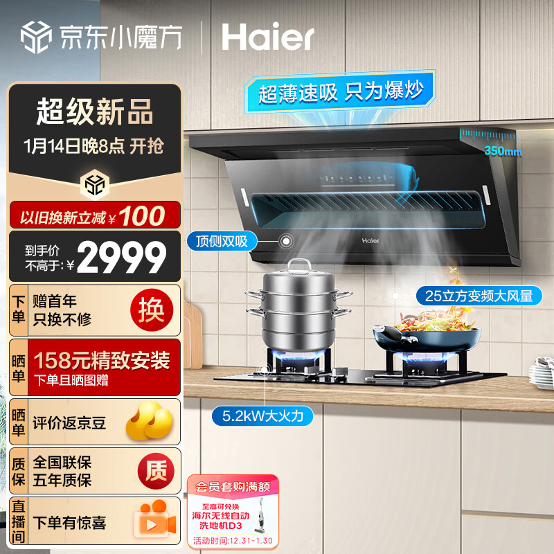 海尔(Haier)抽油烟机 顶侧双吸烟灶套装 变频25m3/min大吸力 家用厨房吸油烟机燃气灶具套装C61+Q2BE3天价格:2999.00元!