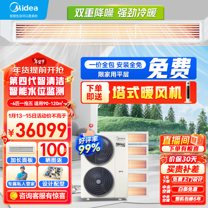 美的(Midea)中央空调一拖五风管机6匹小多联机理想家三代一级能效快速冷暖智能清洁MJV-140W-E01-LXⅢ价格:36199.00元!