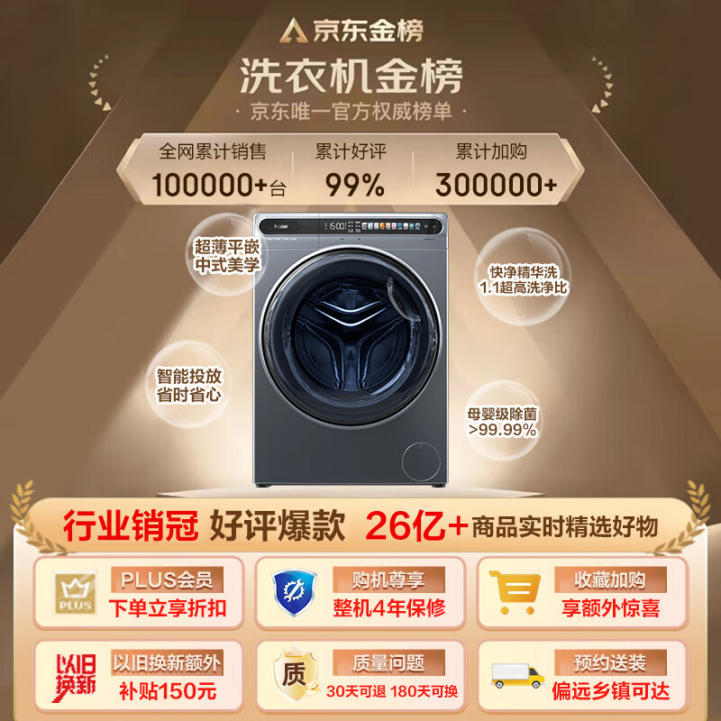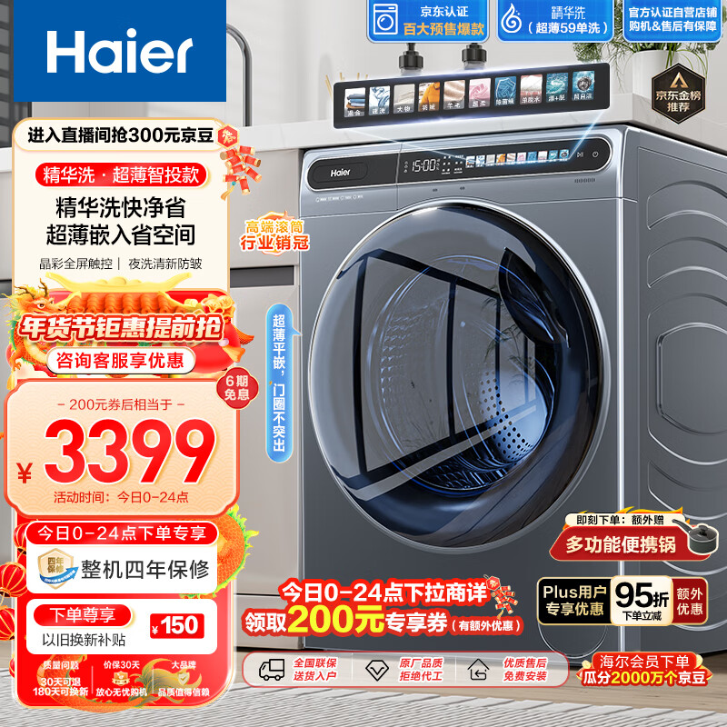 海尔(Haier)滚筒洗衣机全自动 精华洗59 旗舰款 10公斤大筒径 超薄彩屏 智能投放 以旧换新EG100MATESL59S价格:3599.00元!