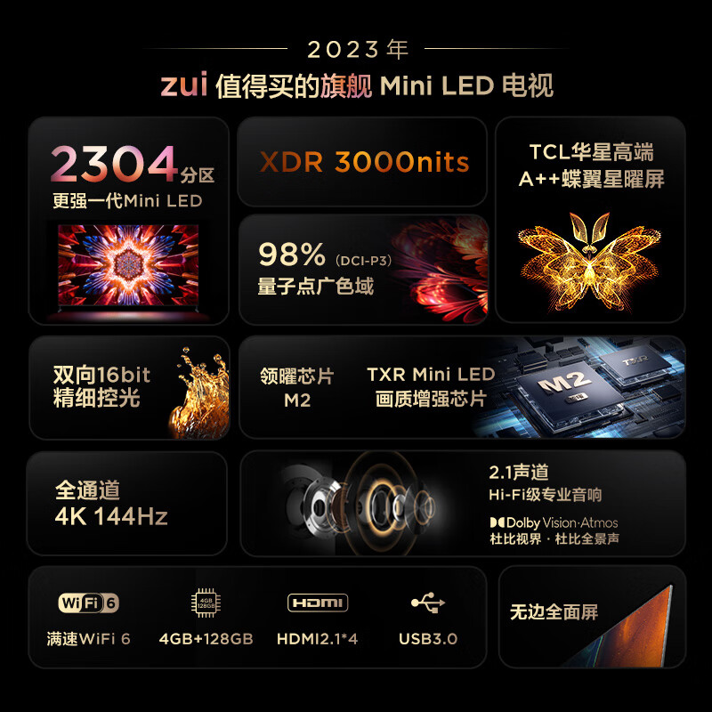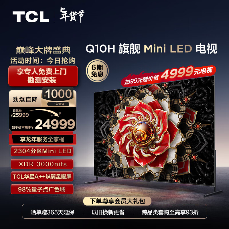 TCL电视 98Q10H 98英寸 Mini LED 2304分区 3000nits A++蝶翼星曜屏 4K巨幕 液晶智能平板电视机100价格:24999.00元!