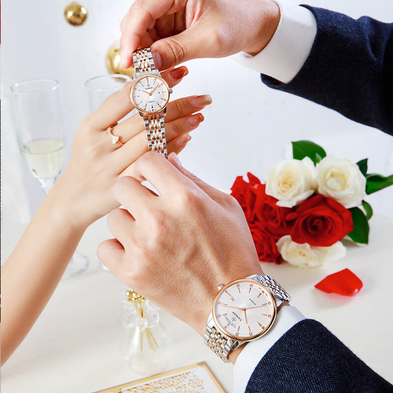 天珺(TANGIN)进口瑞士手表 机械情侣瑞表 休闲钢带情侣手表 T7058GLHWFBB价格:7950.00元!