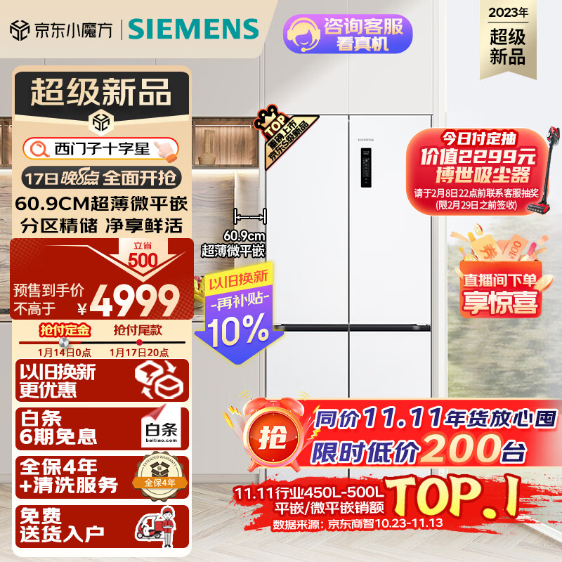 西门子(SIEMENS)十字星系列497升超薄微平嵌冰箱双开门四开门十字四门嵌入式近60cm净味变温储鲜白色KC502081EC价格:5499.00元!