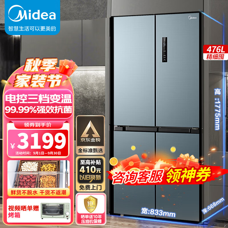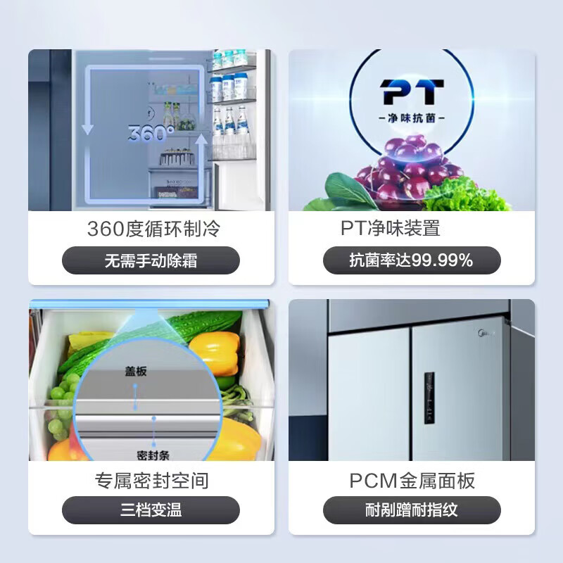美的(Midea)冰箱476升四开门十字对开 家用大容量 双循环双变频 PT净味 超薄电冰箱BCD-476WSPZM(E)价格:4299.00元!