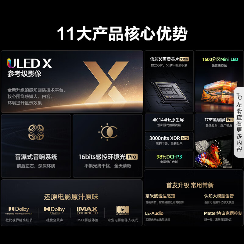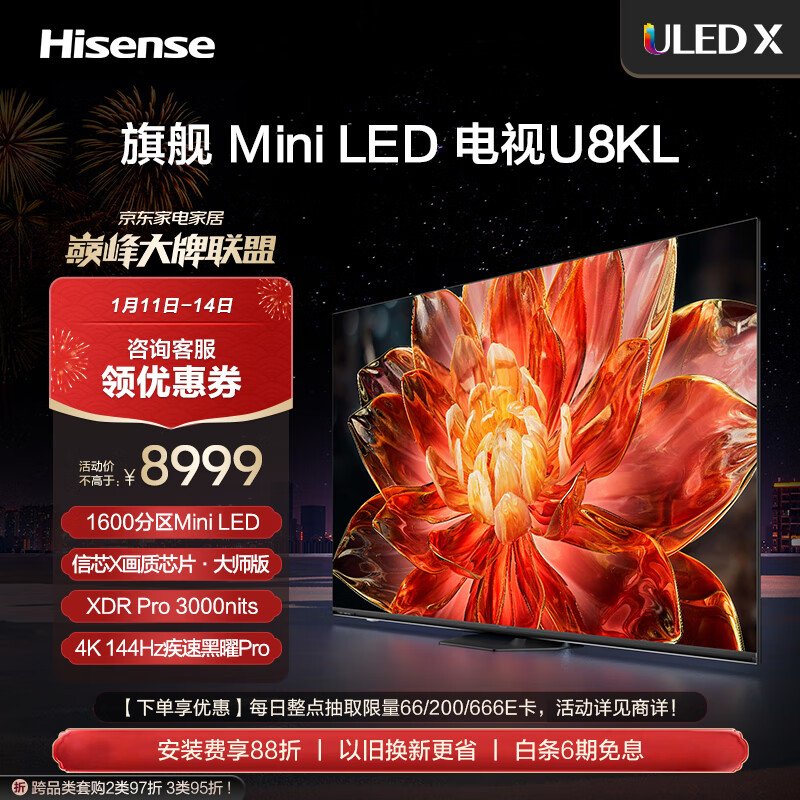 海信电视65U8KL 65英寸 ULED X 旗舰Mini LED 1600分区 3000nits 黑曜屏 PRO 液晶智能电视机 以旧换新价格:8999.00元!
