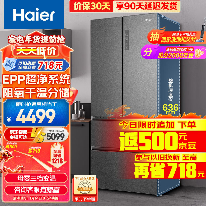 海尔(Haier)510升法式多门四开门电冰箱大容量家用一级能效变频无霜除菌变温超薄嵌入式BCD-510WGHFD59S9U1价格:5099.00元!