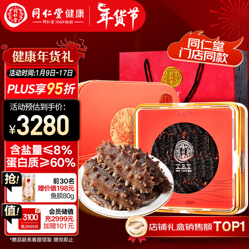 同仁堂(TRT)北京同仁堂大连淡干海参辽参105g27-32只海参干货过年礼盒价格:3280.00元!