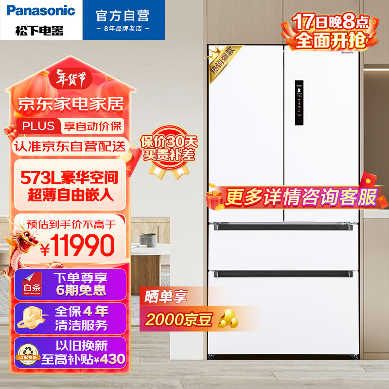 松下(Panasonic)【大海豚】573升法式多门648mm超薄嵌入冰箱四开门大容量一级能效磨砂白家用冰箱NR-EW57TMA-W价格:11990.00元!