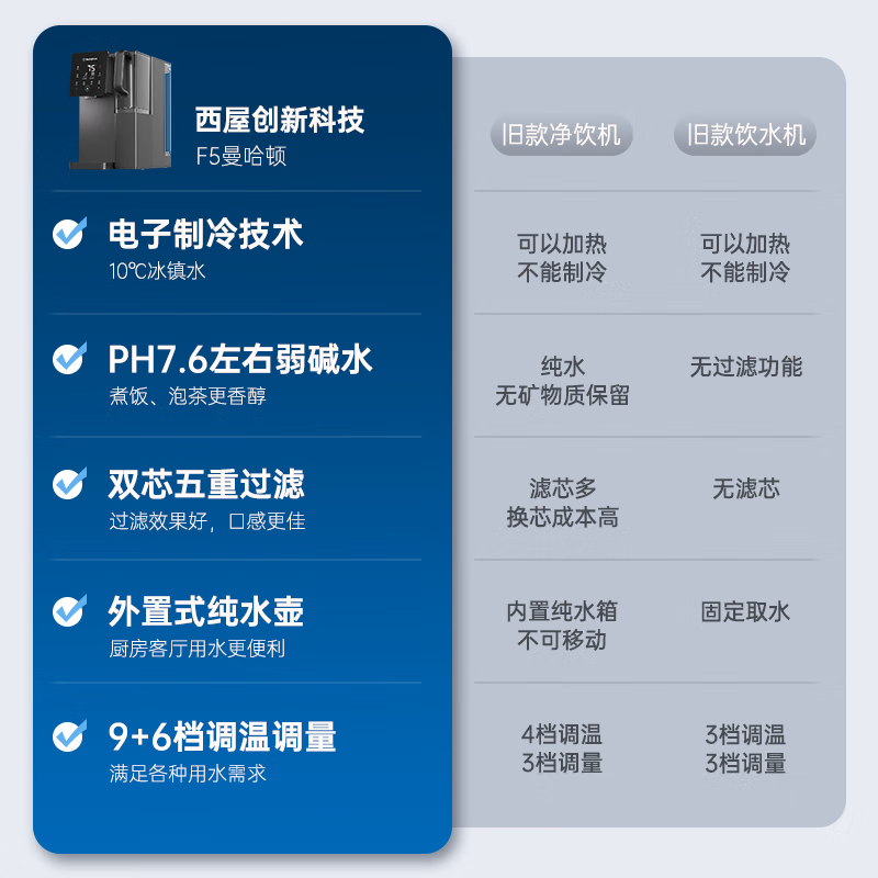 此款西屋WFHRO-F5挺好的, 做工精细 ,客服很好沟通,以后喝水方便多啦。机器会显示TDS,水量不算大但出水快,加热制冷都很快,放餐边柜的话换水略麻烦,