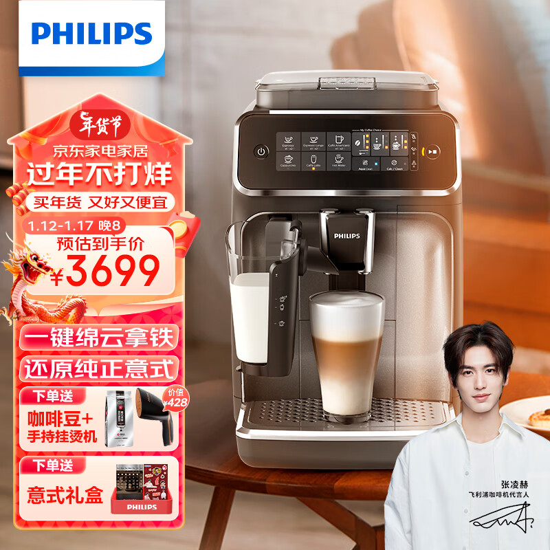 飞利浦(PHILIPS)云朵咖啡机3系EP3146/82 家用/办公室意式浓缩萃取全自动研磨一体机奶泡现磨咖啡豆系统价格:3699.00元!