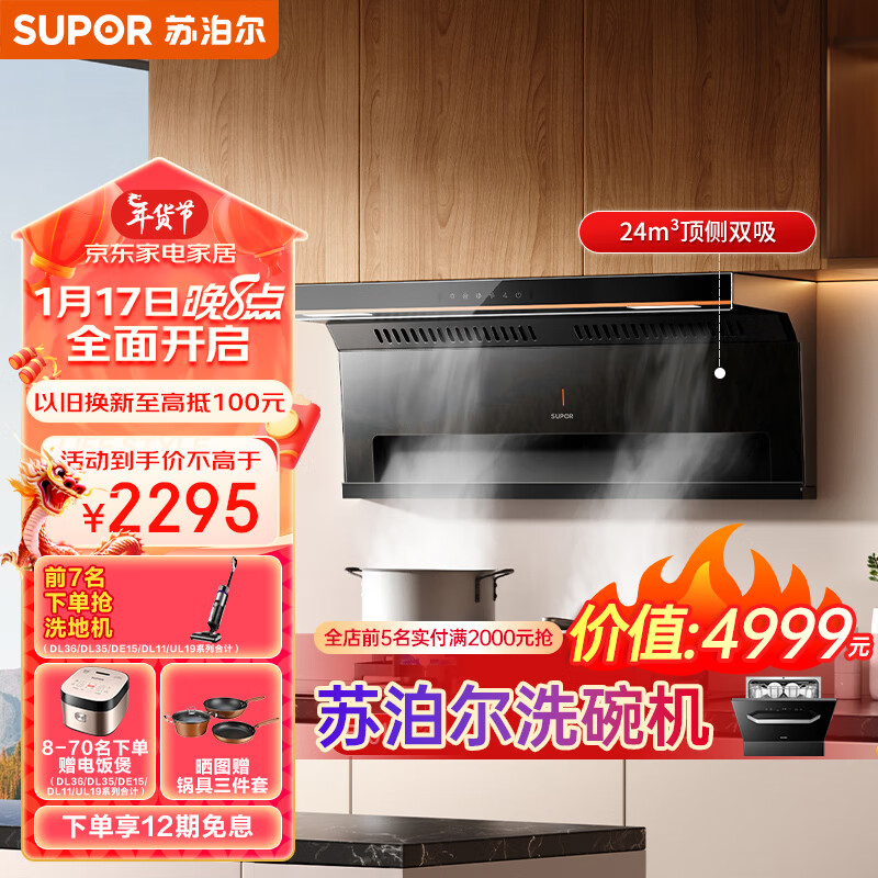 苏泊尔(SUPOR)抽油烟机 双腔拢烟顶侧双吸油烟机灶具套装 24立方吸力变频烟灶 家用油烟机燃气灶 DL35+Q5液化气价格:2295.00元!