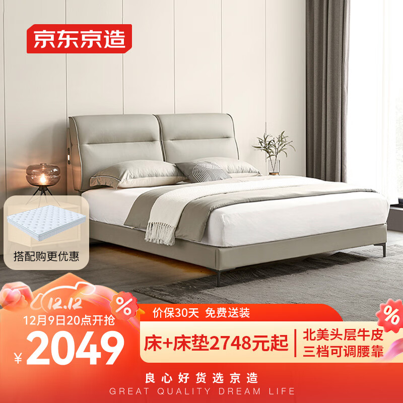 京东京造意式简约真皮高脚床 进口牛皮三档可调靠背 主卧双人床1.5米×2米价格:2399.00元!